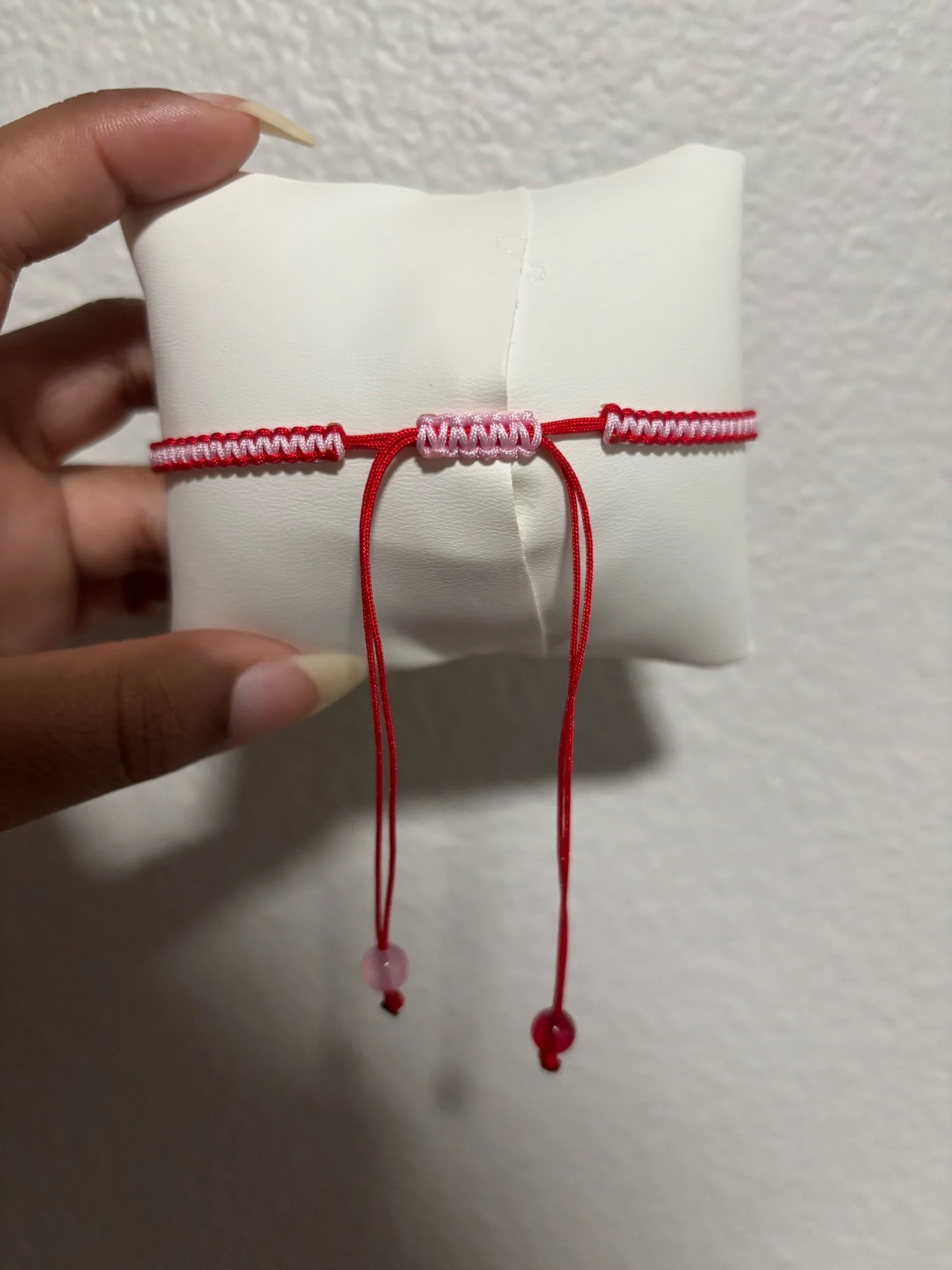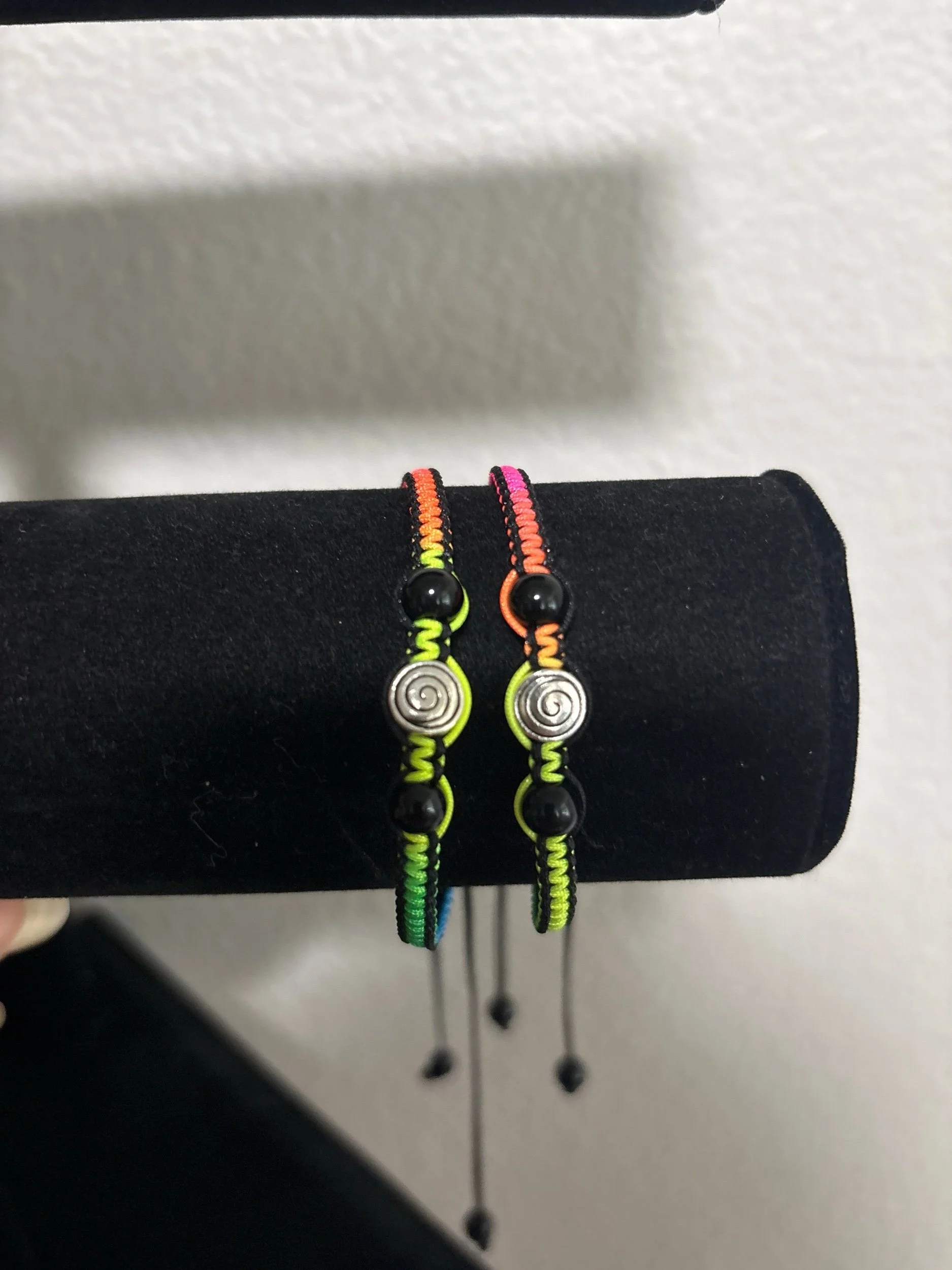 This bracelet is made with nylon string and has charms weaved into it. This bracelet is adjustable and can be used as a bracelet or anklet.